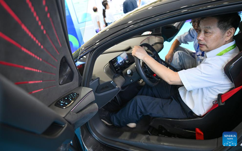 A visitor learns about a new energy vehicle during the 2025 World New Energy Vehicle Congress (WNEVC 2025) in Haikou, south China's Hainan Province, Sept. 27, 2025. The 3-day congress kicked off here on Saturday, featuring series of activities such as conferences and seminars, technology exhibitions, and technology evaluations. (Xinhua/Guo Cheng)
