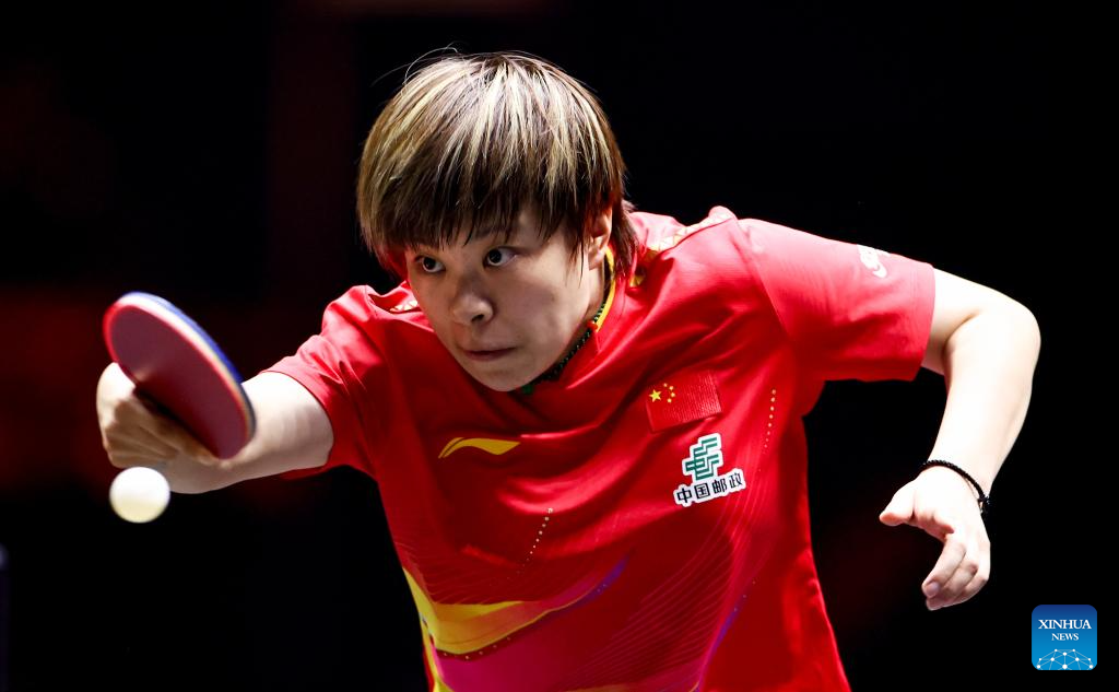 Liu Yangzi hits a return during the women's singles first round match between Wang Yidi of China and Liu Yangzi of Australia at the 2025 World Table Tennis (WTT) China Smash in Beijing, China, Sept. 28, 2025. (Xinhua/Wang Kaiyan)