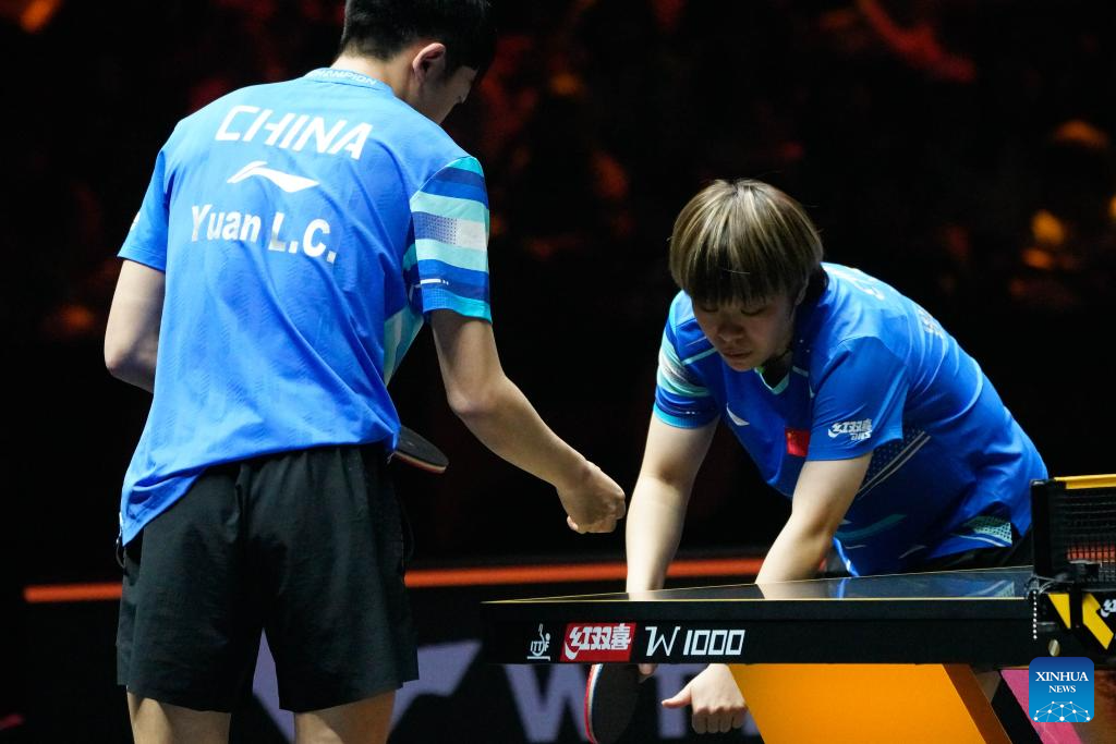 Yuan Licen (R)/Wang Yidi (L) compete during the mixed doulbes round of 32 match between Yuan Licen/Wang Yidi of China and Nandan Naresh/Sally Moyland of the United States at 2025 World Table Tennis (WTT) China Smash in Beijing, China, Sept. 28, 2025. (Xinhua/Xie Han)