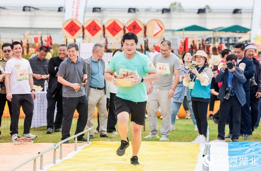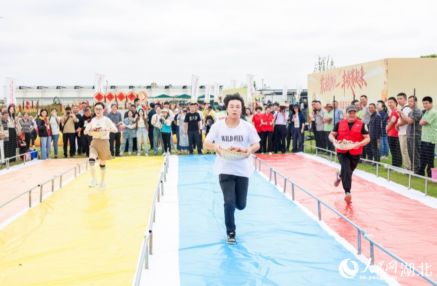 Participants compete in a sweet-potato relay race during sports competitions celebrating the eighth Chinese farmers' harvest festival in Dongxihu district, Wuhan, central China's Hubei Province, Sept. 23, 2025. (People's Daily Online/Guo Tingting)