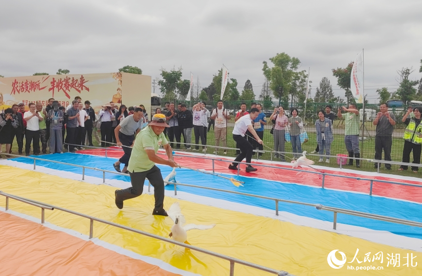 Participants compete in a duck-herding contest during sports competitions celebrating the eighth Chinese farmers' harvest festival in Dongxihu district, Wuhan, central China's Hubei Province, Sept. 23, 2025. (People's Daily Online/Guo Tingting)