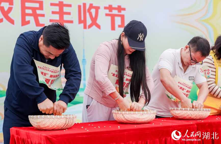 Participants compete in a corn-shelling contest during sports competitions celebrating the eighth Chinese farmers' harvest festival in Dongxihu district, Wuhan, central China's Hubei Province, Sept. 23, 2025. (People's Daily Online/Guo Tingting)