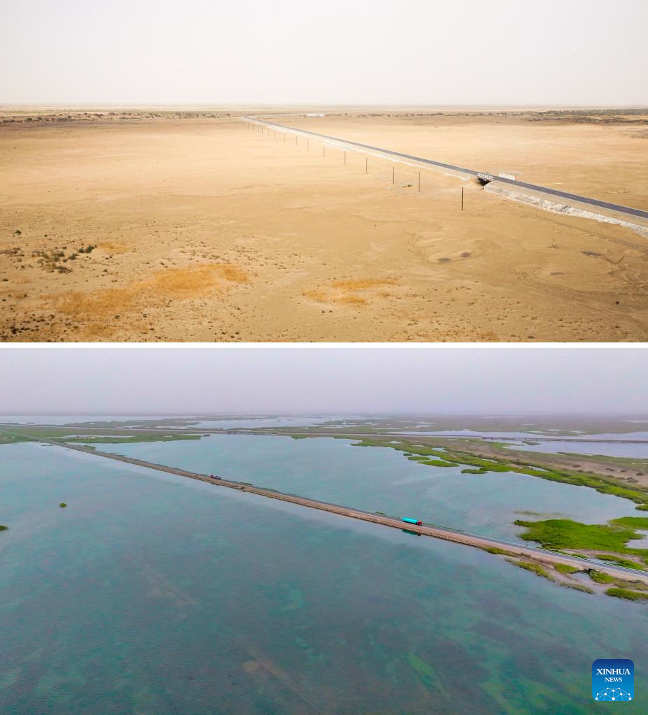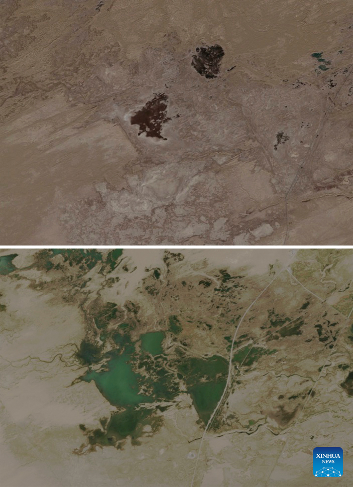 This combo photo shows the satellite images of the Taitema Lake and its surrounding areas in December 2005 (above) and in August 2024 (below) in northwest China's Xinjiang Uygur Autonomous Region. (Xinhua)