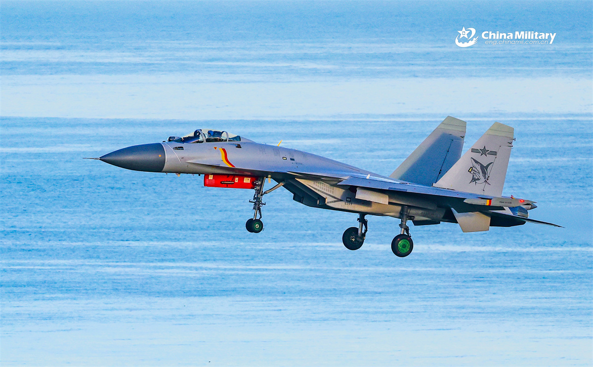 A J-15 carrier-based fighter jet attached to the Chinese PLA Naval Aviation University soars into sky and heads for its designated training airspace during a flight training exercise in mid September, 2025. (eng.chinamil.com.cn/Photo by Jiang Tao)