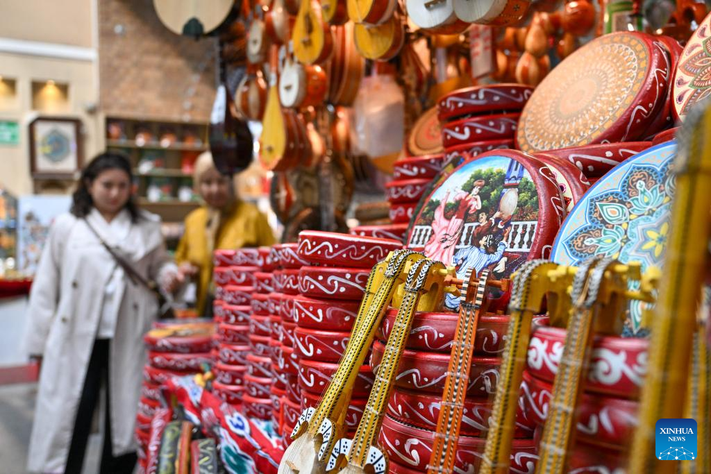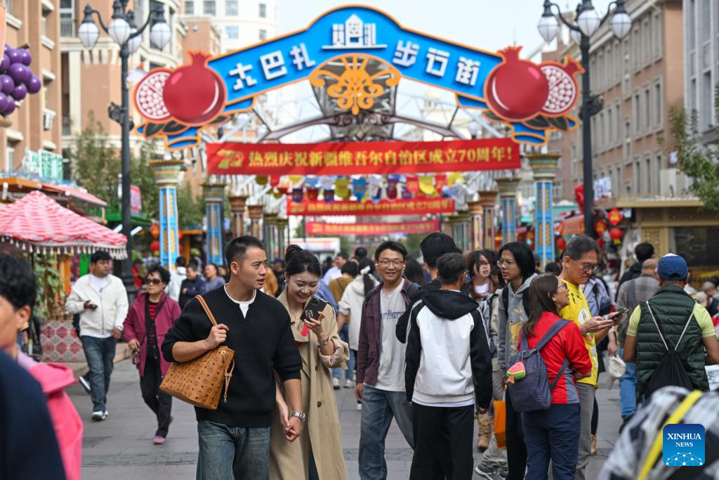 People visit the Xinjiang International Grand Bazaar in Urumqi, northwest China's Xinjiang Uygur Autonomous Region, Oct. 1, 2025. (Xinhua/Ding Lei)