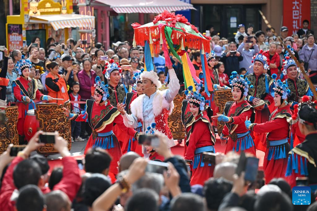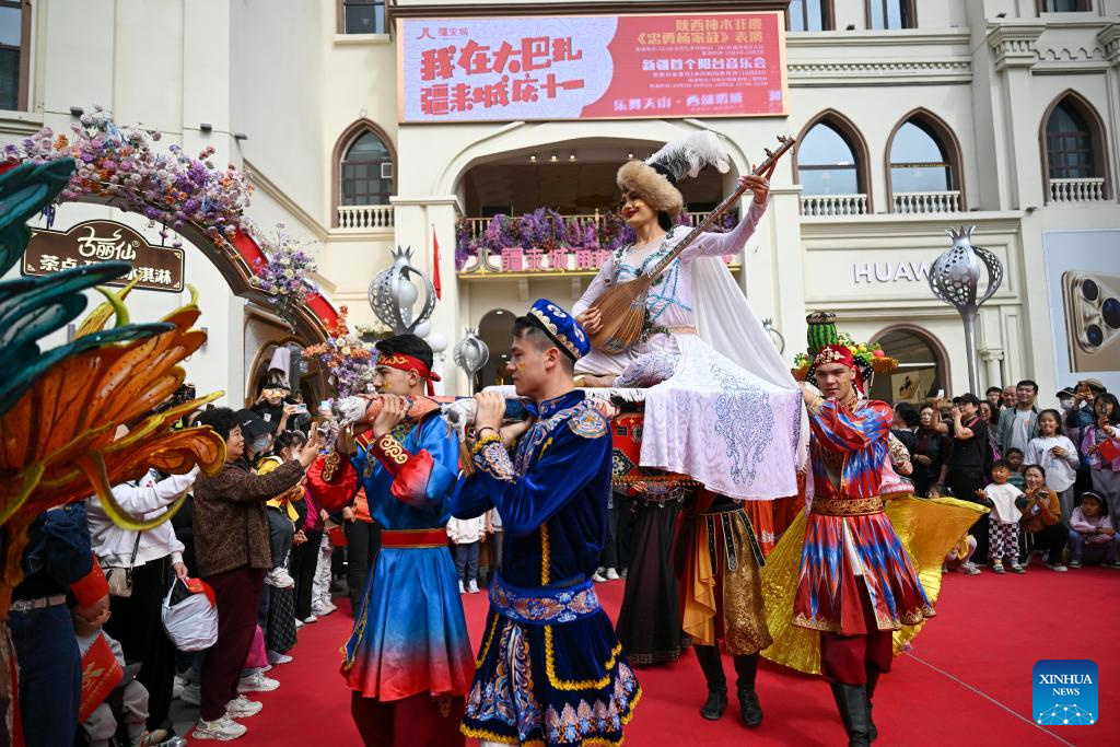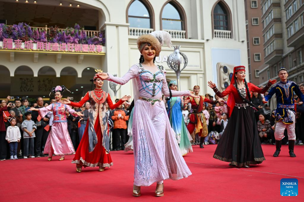 Actors perform at the Xinjiang International Grand Bazaar in Urumqi, northwest China's Xinjiang Uygur Autonomous Region, Oct. 1, 2025. (Xinhua/Ding Lei)
