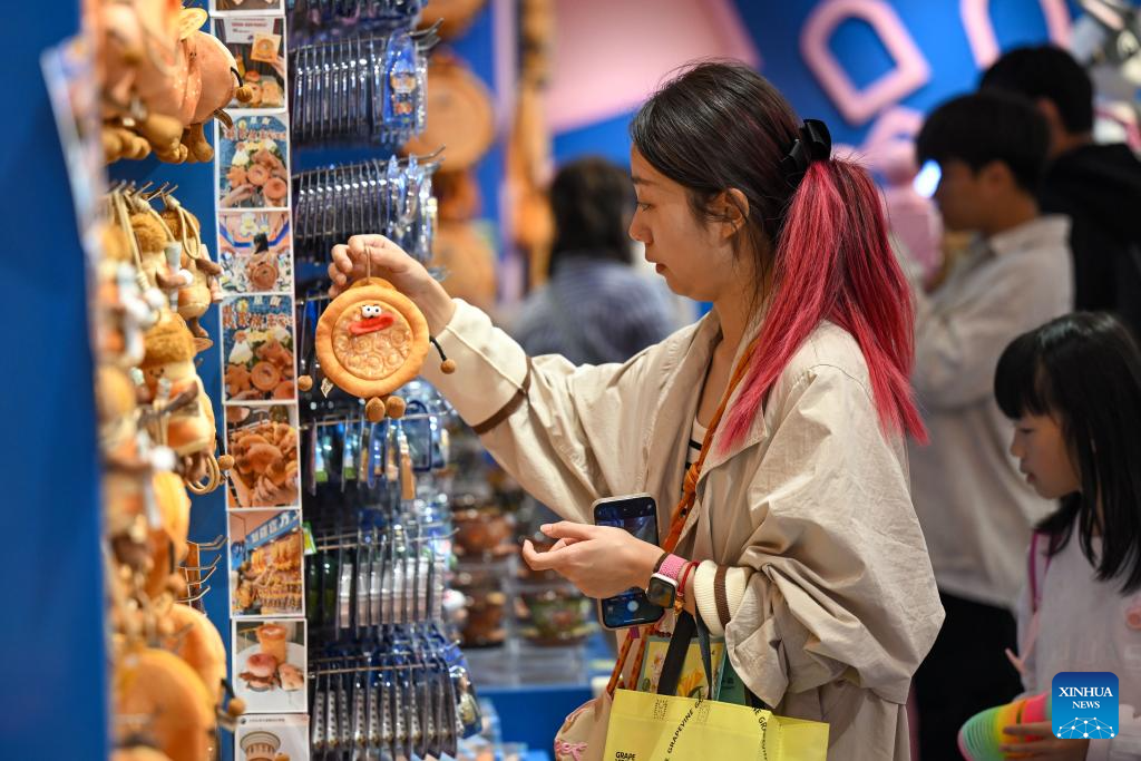A tourist selects commodities at the Xinjiang International Grand Bazaar in Urumqi, northwest China's Xinjiang Uygur Autonomous Region, Oct. 1, 2025. (Xinhua/Ding Lei)