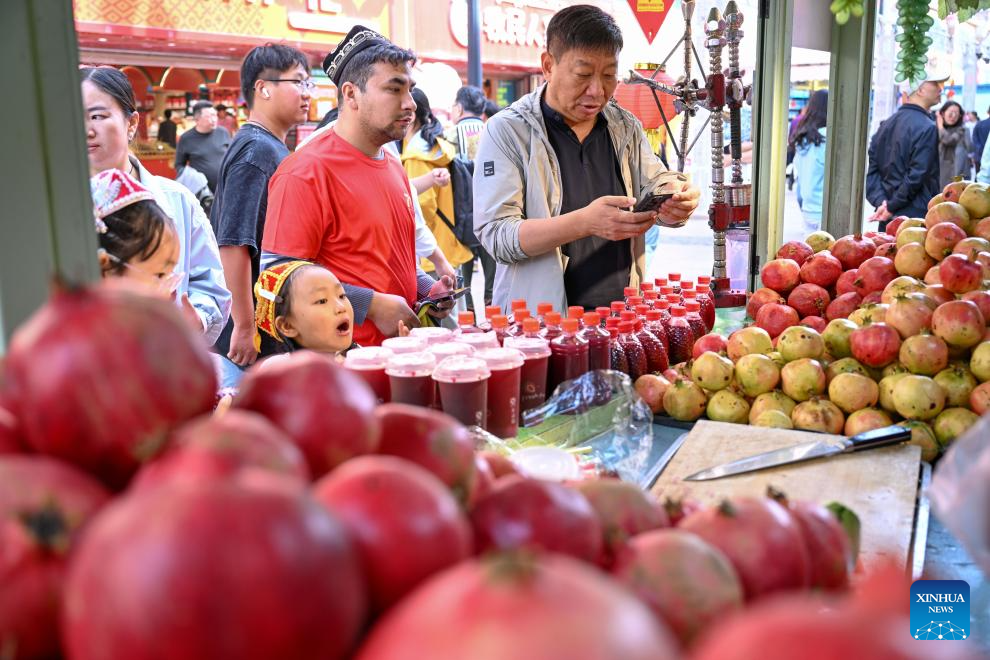 A tourist buys beverages at the Xinjiang International Grand Bazaar in Urumqi, northwest China's Xinjiang Uygur Autonomous Region, Oct. 1, 2025. (Xinhua/Ding Lei)