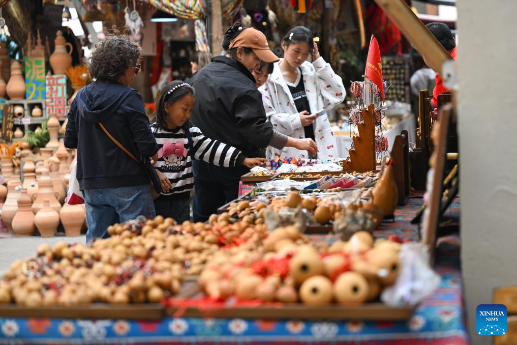 Tourists select commodities at the Xinjiang International Grand Bazaar in Urumqi, northwest China's Xinjiang Uygur Autonomous Region, Oct. 1, 2025. (Xinhua/Ding Lei)