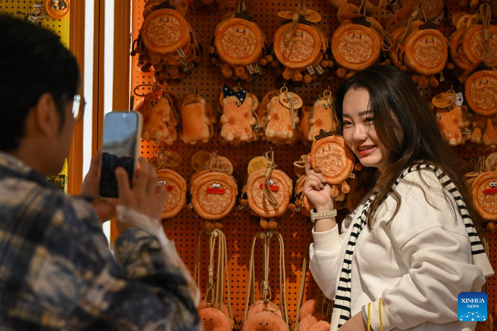 A tourist takes selfies at the Xinjiang International Grand Bazaar in Urumqi, northwest China's Xinjiang Uygur Autonomous Region, Oct. 1, 2025. (Xinhua/Ding Lei)