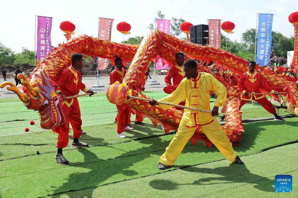 Locals stage a dragon dance performance during the groundbreaking ceremony for the Bright International Amusement Park in Afienya, Greater Accra Region, Ghana, Oct. 4, 2025. (Photo by Seth/Xinhua)