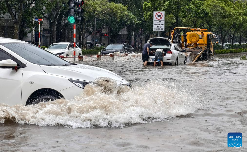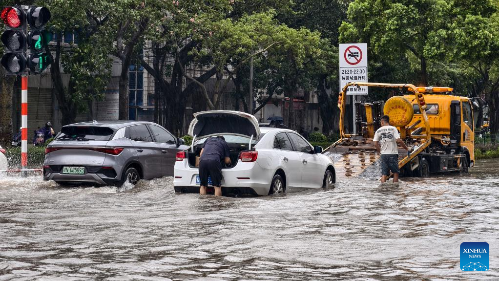 A rescue vehicle tows a stranded car in Qinzhou City, south China's Guangxi Zhuang Autonomous Region, Oct. 6, 2025. Typhoon Matmo, the 21st named storm of the 2025 Pacific typhoon season, made landfall along the coast of Guangxi on Monday, bringing strong winds and heavy rainfall. (Photo by Ao Shuaichang/Xinhua)
