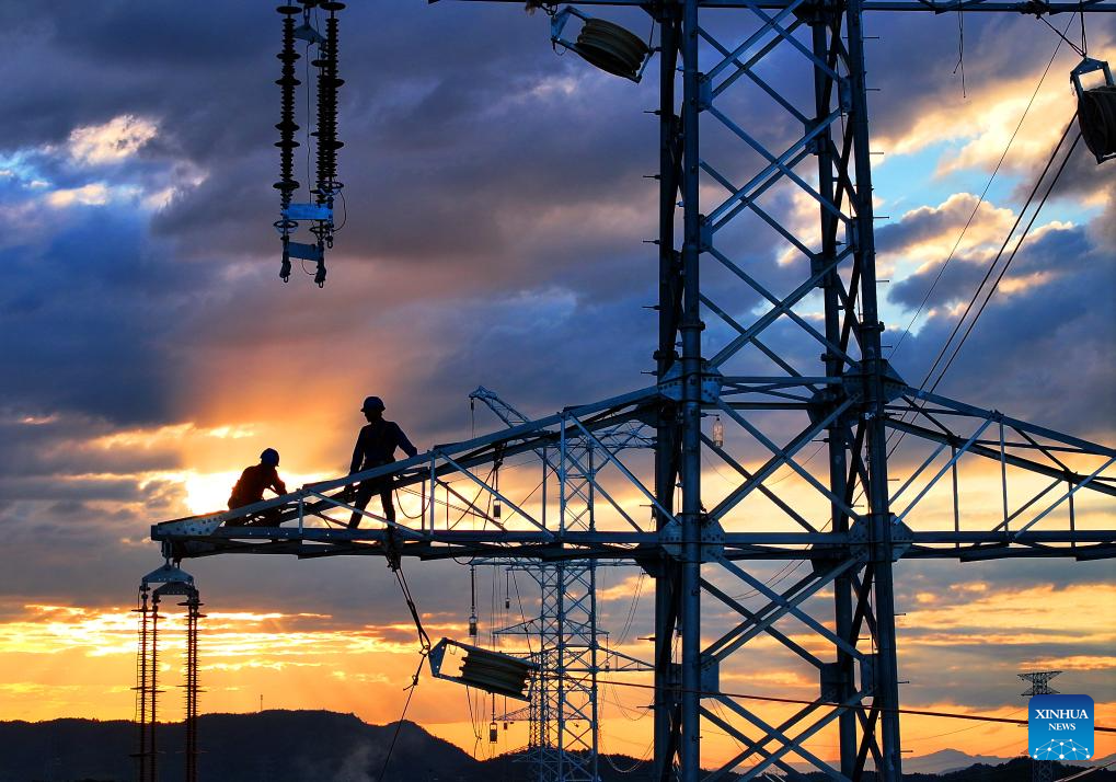 A drone photo taken on Oct. 6, 2025 shows workers carrying out cable installation work on a high tower in Hengyang, central China's Hunan Province. Many workers have been standing fast at their posts and fulfilling their duties during the eight-day National Day and Mid-Autumn Festival holiday. (Photo by Cao Zhengping/Xinhua)