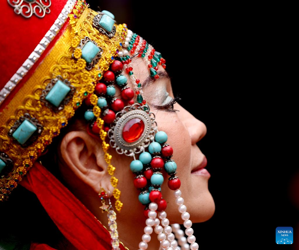 An artist in a costume of Mongolian ethnic group, prepares before performing at a show for the celebration of the Chinese Mid-Autumn Festival in London, Britain, Oct. 5, 2025. A show for the celebration of the Chinese Mid-Autumn Festival was staged in London Chinatown on Sunday afternoon, impressing many with performances featuring Chinese culture and art. (Xinhua/Li Ying)