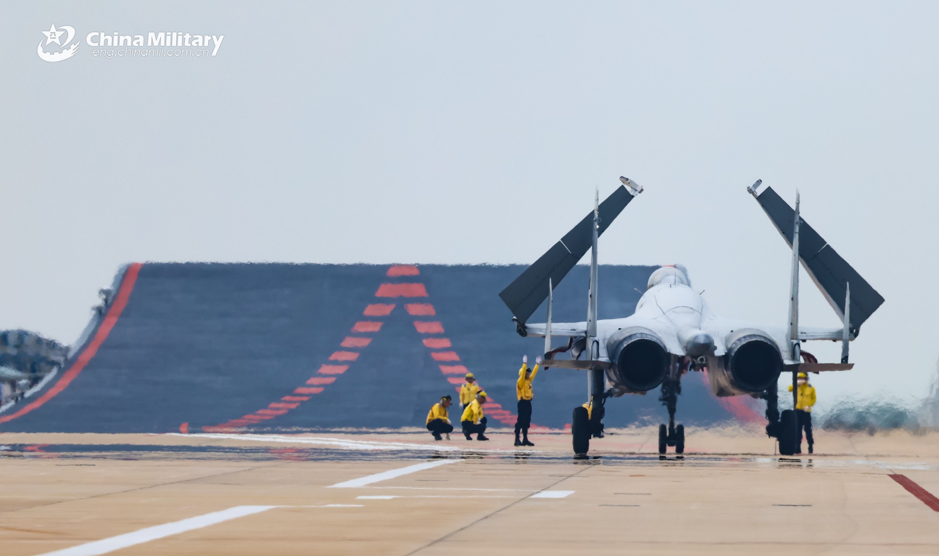 Aircraft handling officers assigned to a training base of the Chinese PLA Naval Aviation University signals a J-15 carrier-based fighter jet to move during a take-off and landing training exercise in late September, 2025. (eng.chinamil.com.cn/Photo by Jiang Tao)
