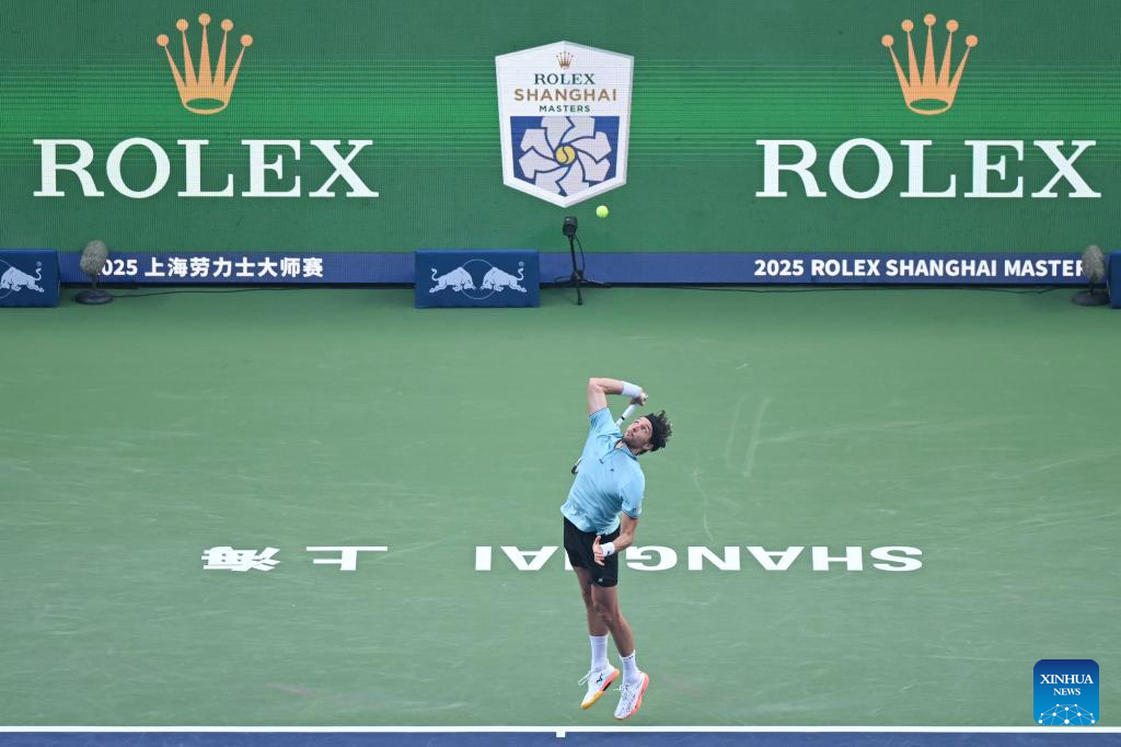 Arthur Rinderknech of France serves to Felix Auger-Aliassime of Canada during the men's singles quarterfinal at the ATP World Tour Shanghai Masters tennis tournament in Shanghai, east China, Oct. 10, 2025. (Xinhua/Wang Xiang)