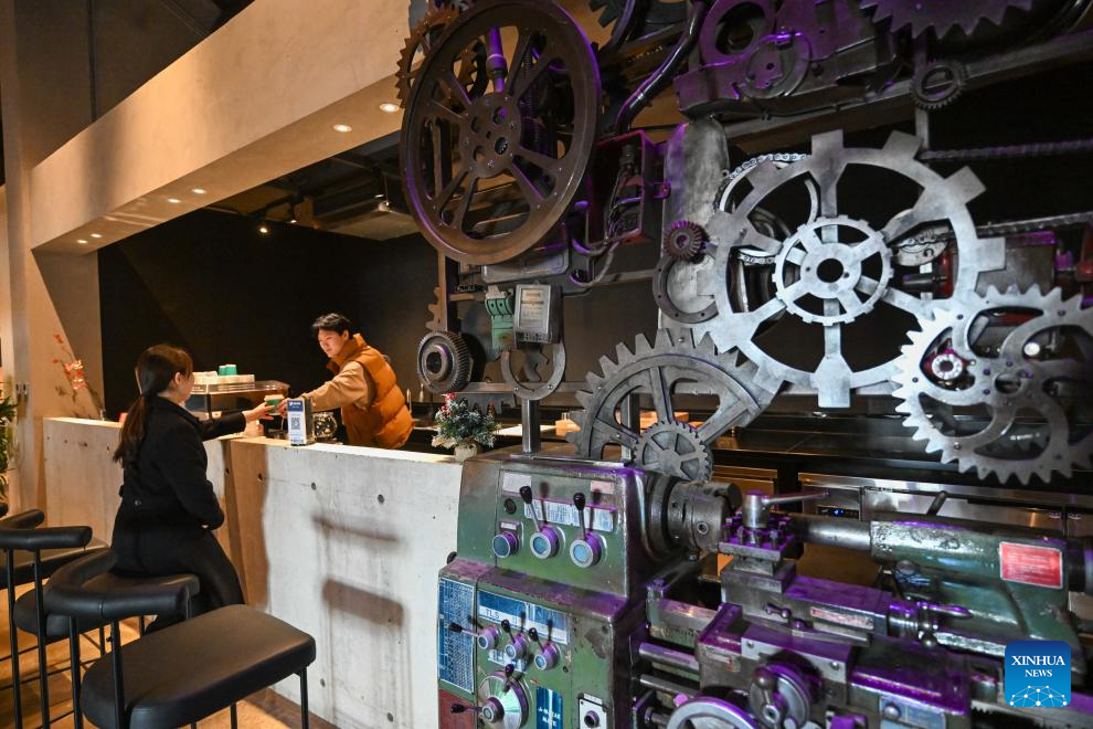 A coffee shop is seen during the soft opening at the industrial park rebuilt from the old factory area of Tianjin No. 1 Machine Tool Co., Ltd. in north China's Tianjin, Jan. 3, 2024. (Xinhua/Sun Fanyue)