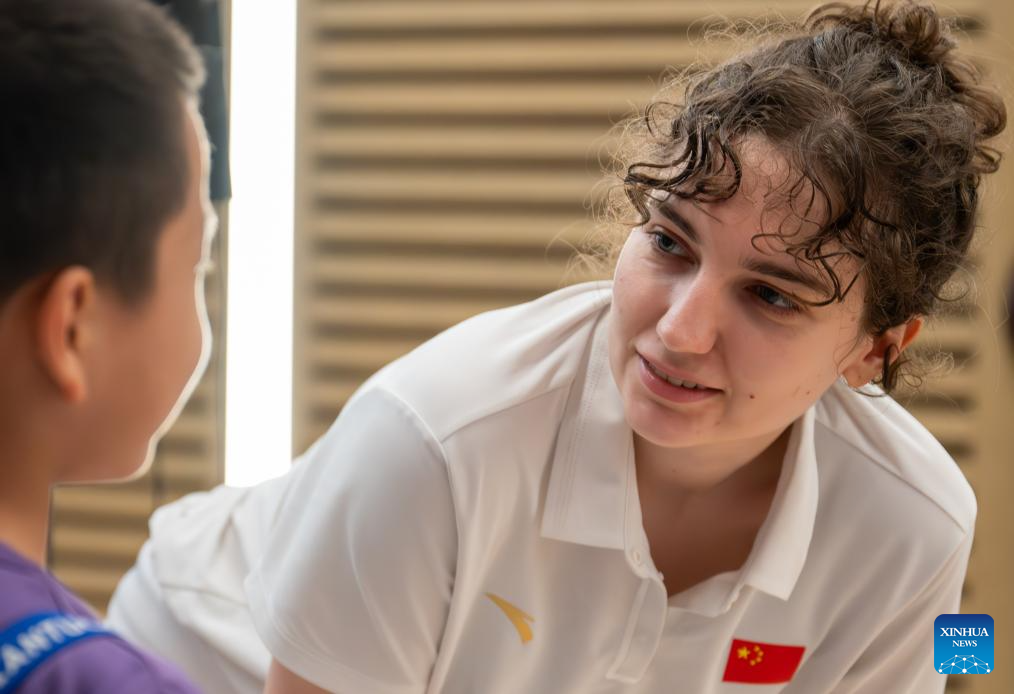 Zaparivannaia Mariia talks with a trainee at a fencing club in Wuhan, central China's Hubei Province, Oct. 10, 2025. (Xinhua/Du Zixuan)