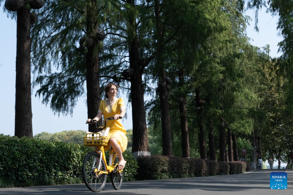 Zaparivannaia Mariia rides a bike at a scenic spot in Wuhan, central China's Hubei Province, Oct. 9, 2025. (Xinhua/Du Zixuan)