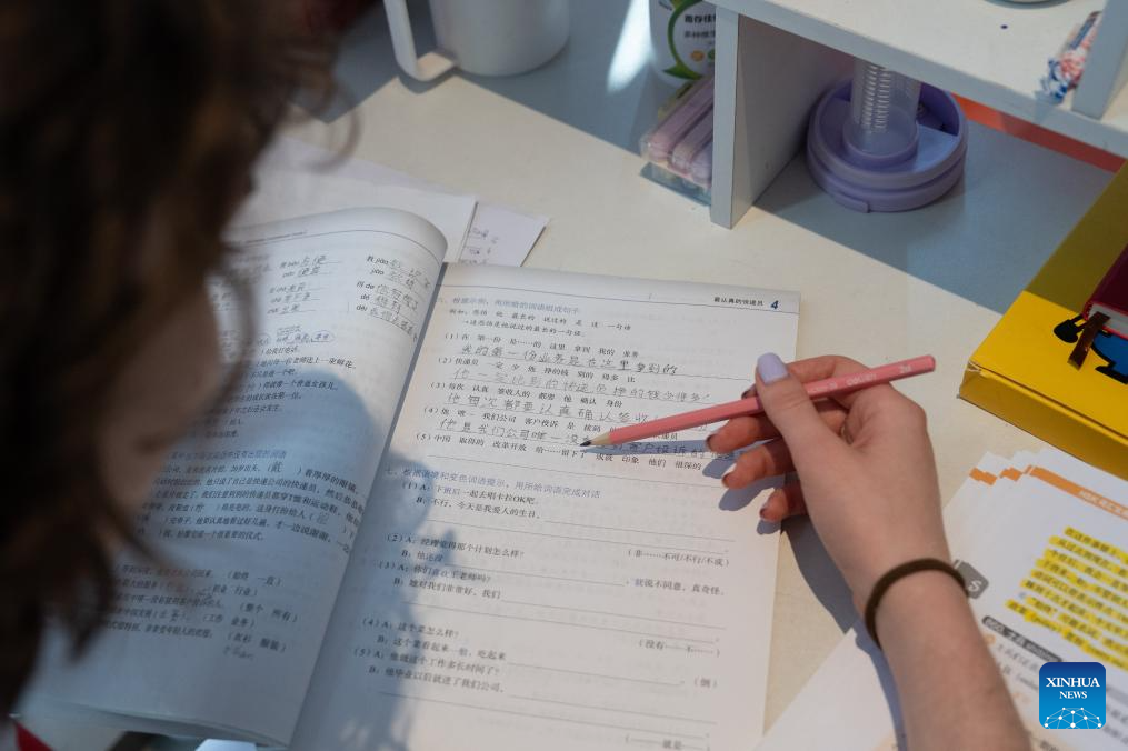 Zaparivannaia Mariia learns Chinese while working at a fencing club in Wuhan, central China's Hubei Province, Oct. 8, 2025. (Xinhua/Du Zixuan)