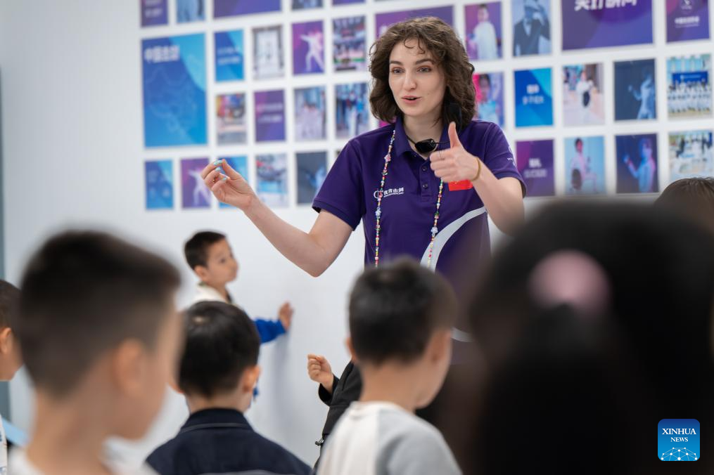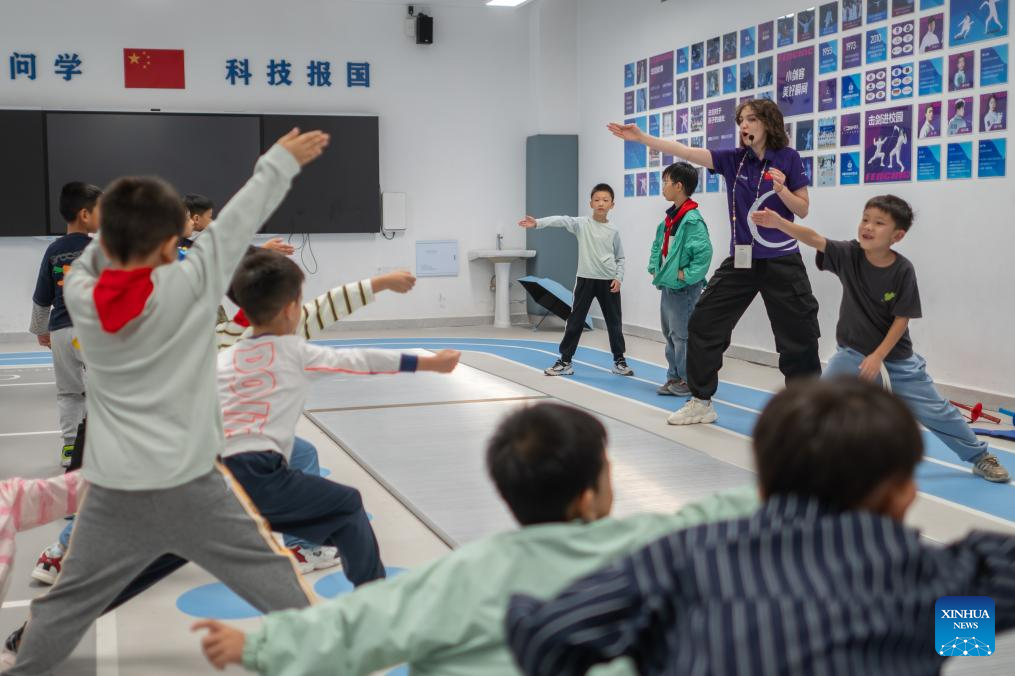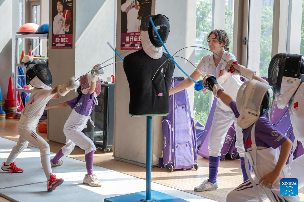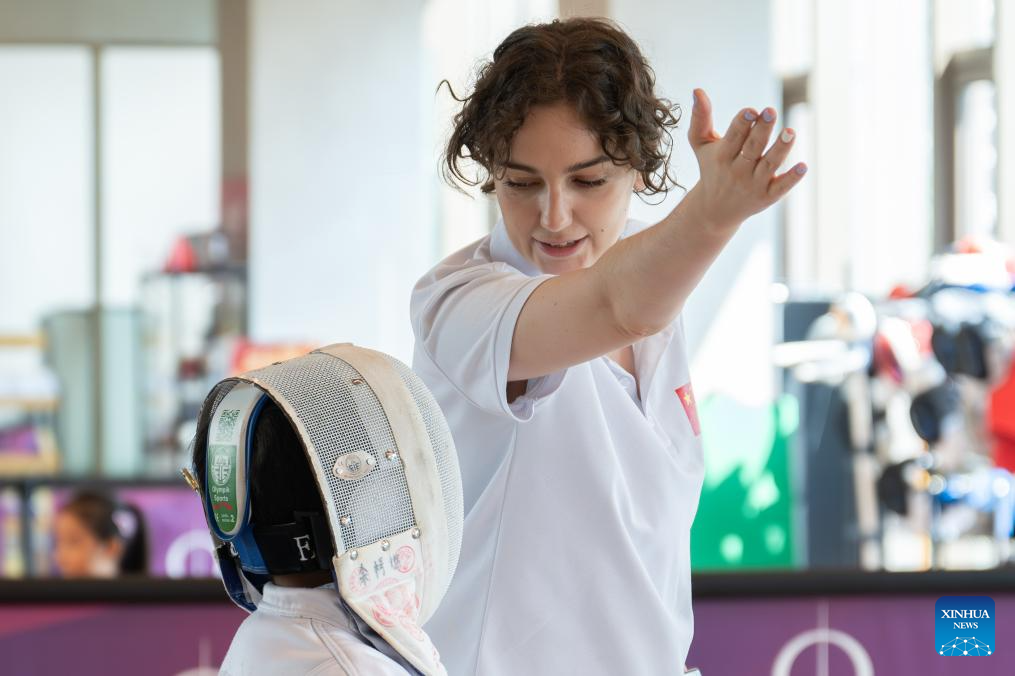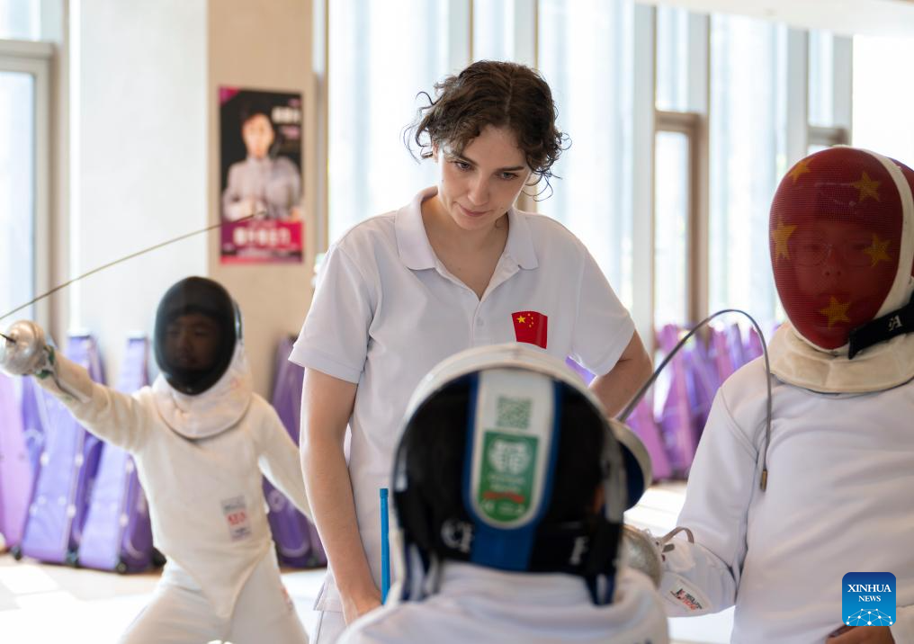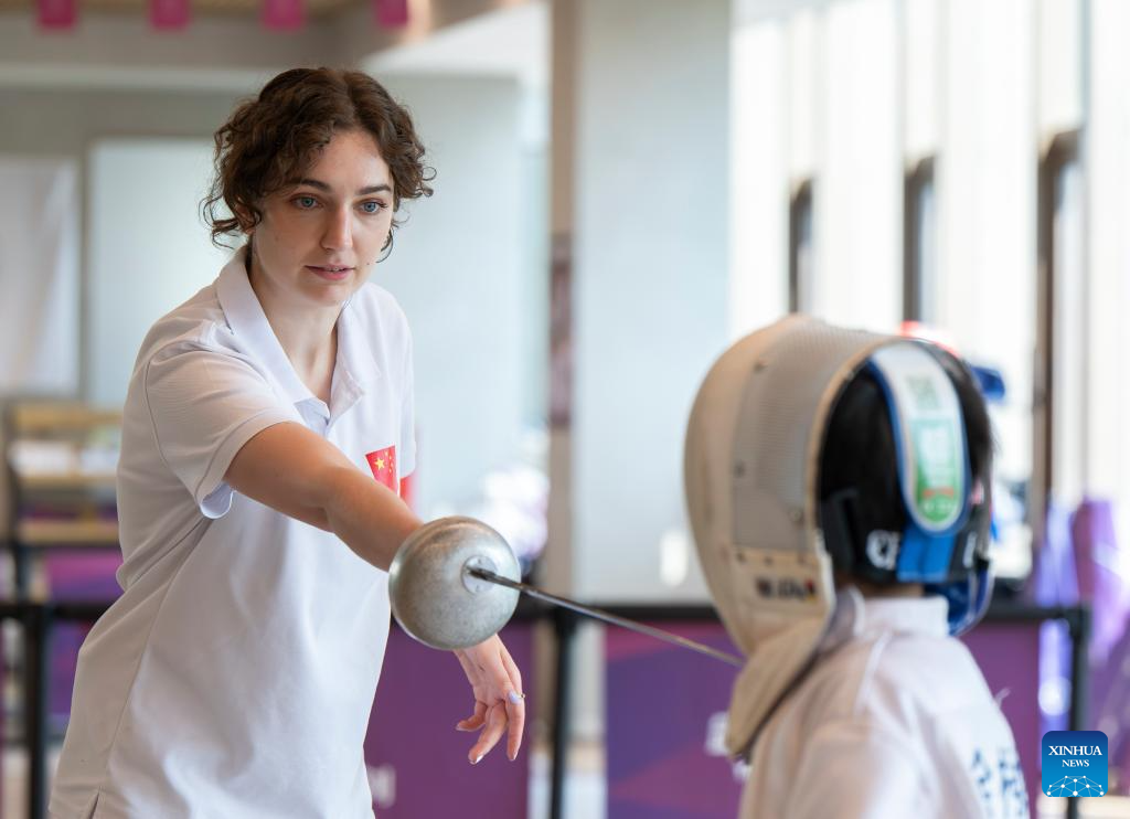Zaparivannaia Mariia gives a lesson at a fencing club in Wuhan, central China's Hubei Province, Sept. 24, 2025. (Xinhua/Du Zixuan)