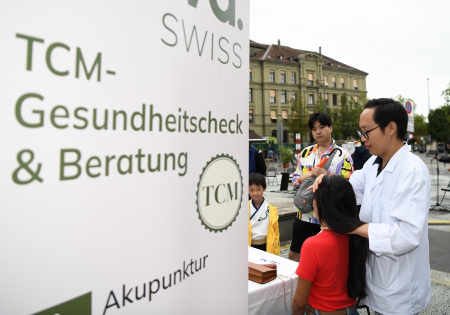 A visitor tries Tuina massage, a traditional Chinese medicine technique, during a "Hello! China" culture and tourism promotion event in Bern, Switzerland, Sept. 21, 2025. The event, hosted by the China Cultural Center in Bern, was held here on Sunday, featuring stage performances, including Taiji fan, traditional Chinese music and folk dances, as well as hands-on cultural experiences such as traditional Chinese medicine therapy, calligraphy, woodblock printing, sachets and handcrafted fans making. (Xinhua/Lian Yi)