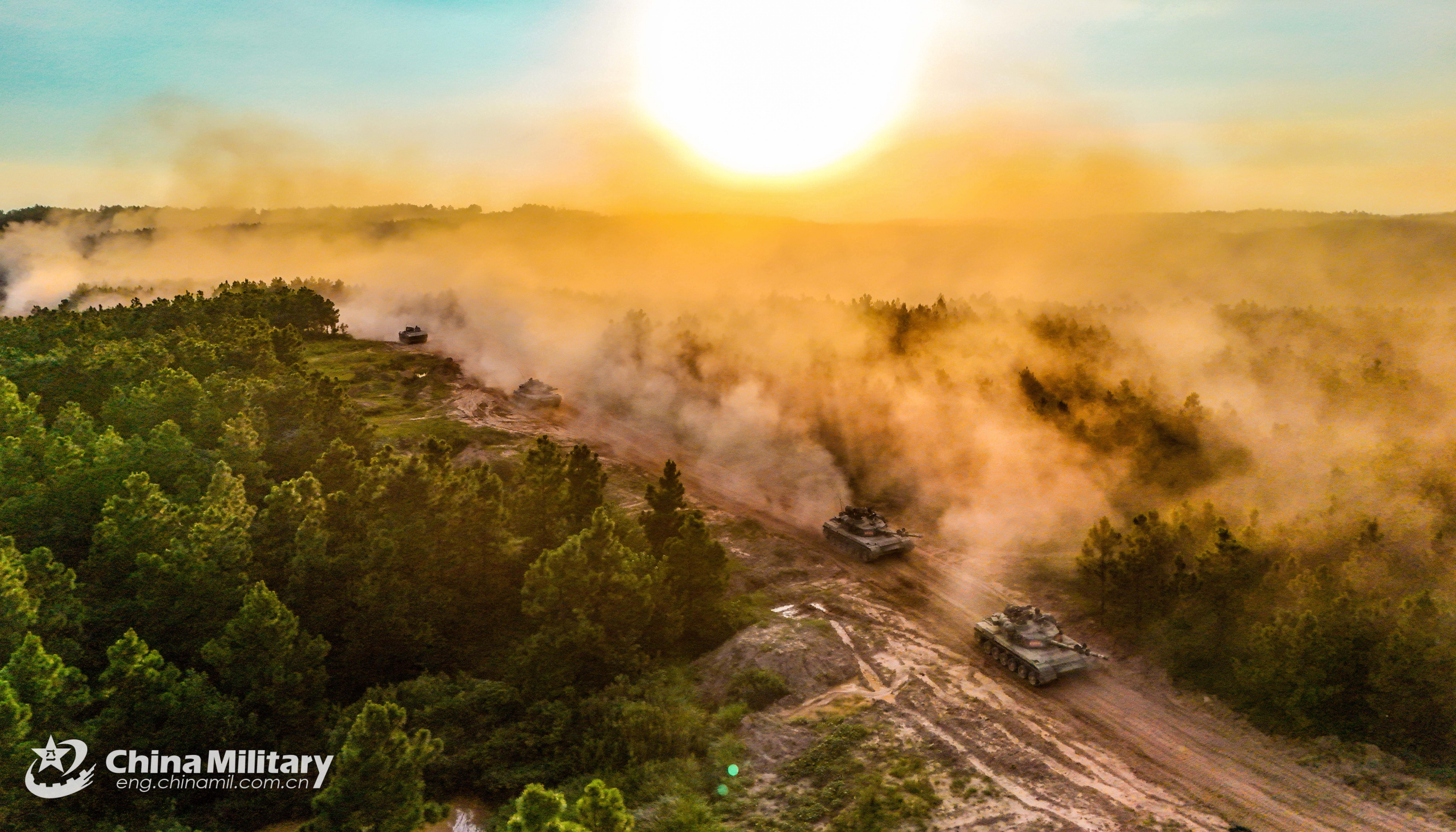 Main battle tanks (MBTs) attached to a combined-arms brigade under the Chinese PLA 71st Group Army kick up plumes of dust during a maneuver training exercise in late September, 2025. (eng.chinamil.com.cn/Photo by Lin Weihong)
