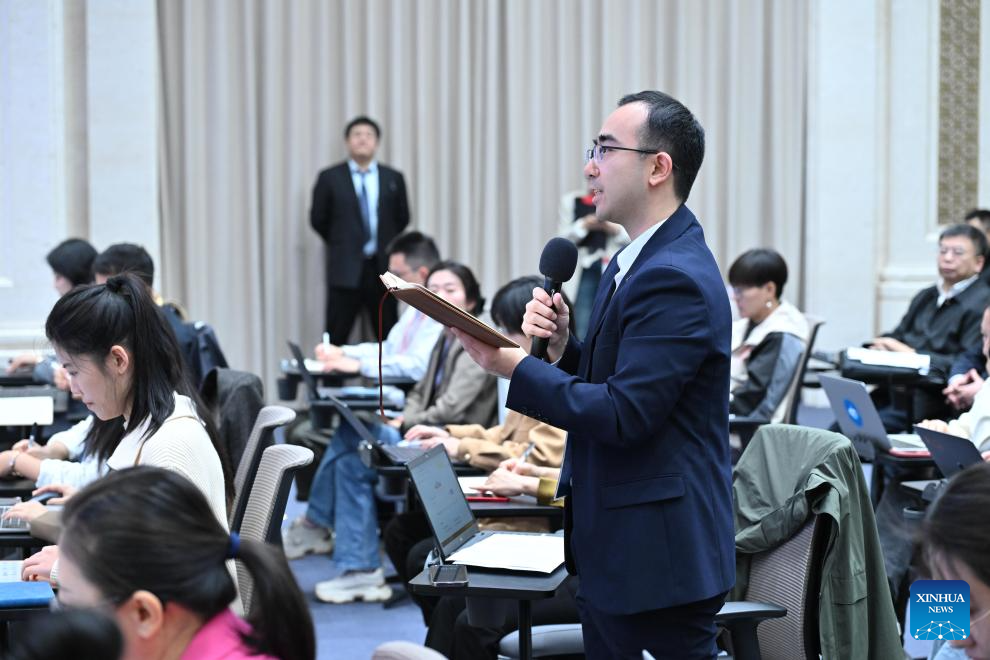 A journalist asks questions at a press conference held by the State Council Information Office (SCIO) on achievements in high-quality housing and urban-rural development during the 14th Five-Year Plan period (2021-2025) in Beijing, capital of China, Oct. 11, 2025. (Xinhua/Li Xin)
