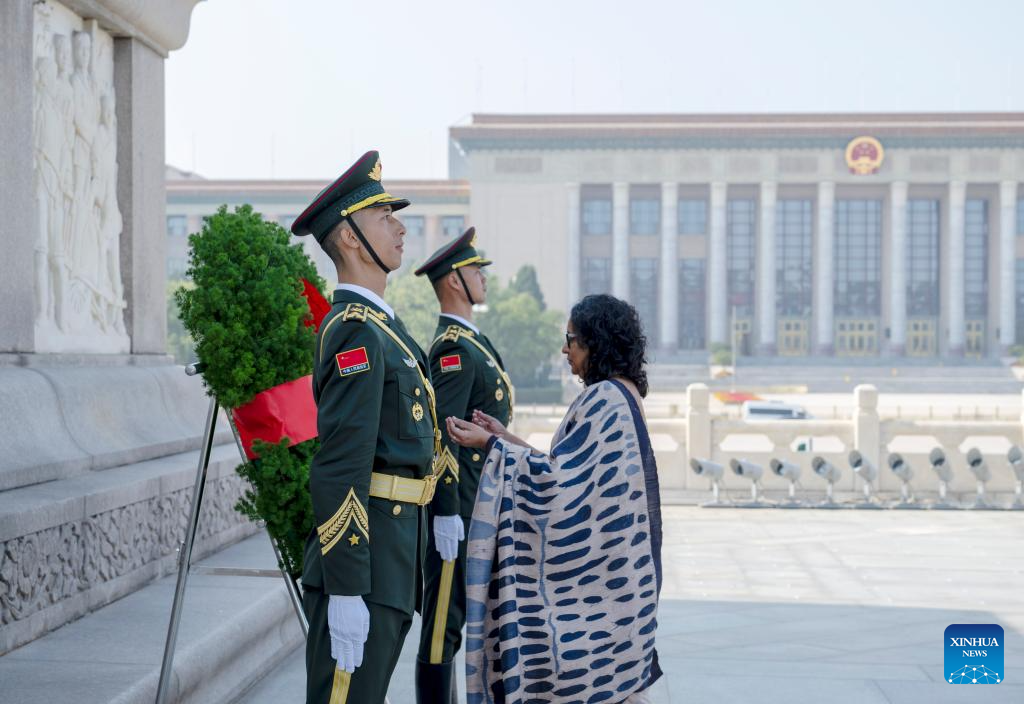 Sri Lankan Prime Minister Harini Amarasuriya lays a wreath at the Monument to the People's Heroes on Tian'anmen Square in Beijing, capital of China, Oct. 14, 2025. (Xinhua/Zhai Jianlan)
