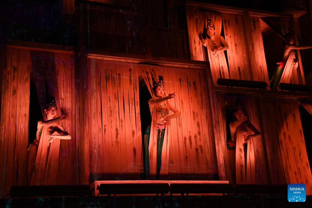 Actresses perform during the immersive drama "Encore Dunhuang" in Dunhuang, northwest China's Gansu Province, Oct. 15, 2025. The immersive drama "Encore Dunhuang" showcases Dunhuang's history, costumes, and music and dance culture. The drama have been performed over 1,000 times this year, attracting over 500,000 viewers. (Xinhua/Fan Peishen)
