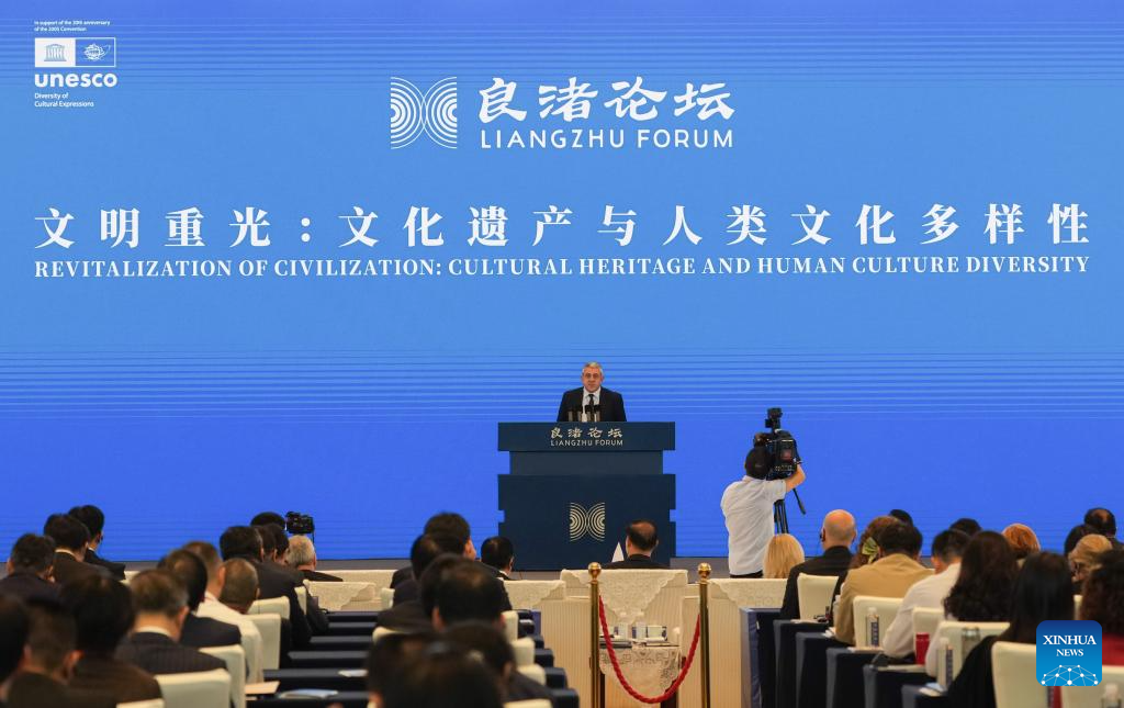 UN Tourism Secretary-General Zurab Pololikashvili addresses the opening ceremony of the third Liangzhu Forum in Hangzhou, east China's Zhejiang Province, Oct. 18, 2025. Themed on "Revitalization of Civilization: Cultural Heritage and Human Culture Diversity," the third Liangzhu Forum opened here on Saturday. (Xinhua/Huang Zongzhi)