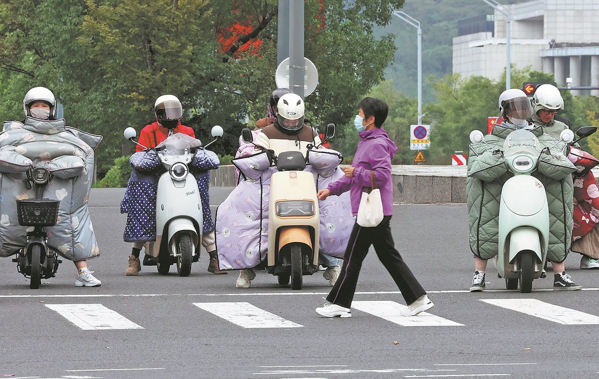 People venture out fully bundled up in Haizhou district, Lianyungang, Jiangsu province on Monday, as a cold front sweeps across China's central and eastern regions. GENG YUHE/FOR CHINA DAILY
