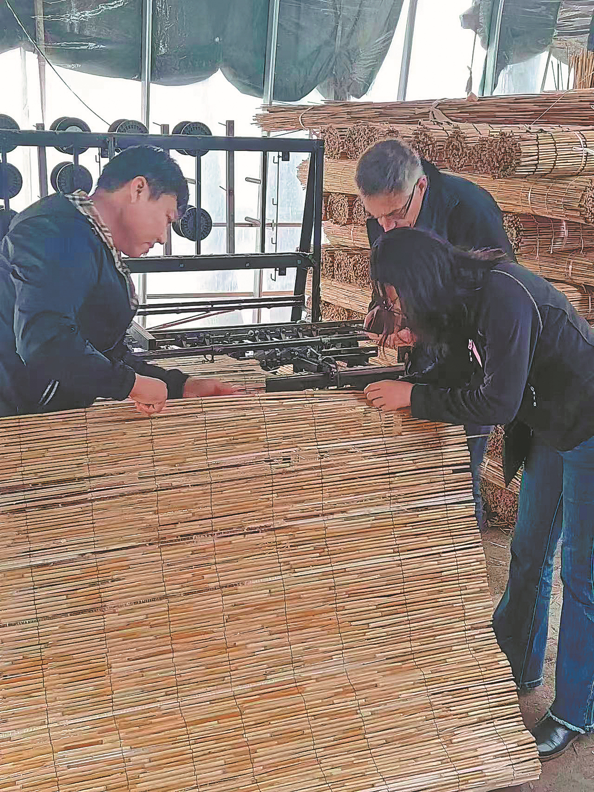 A foreign client (second from right) checks the reed panels at the factory of the Renqiu Zhaolong Reed Specialty Cooperative in Xiong'an. CHINA DAILY