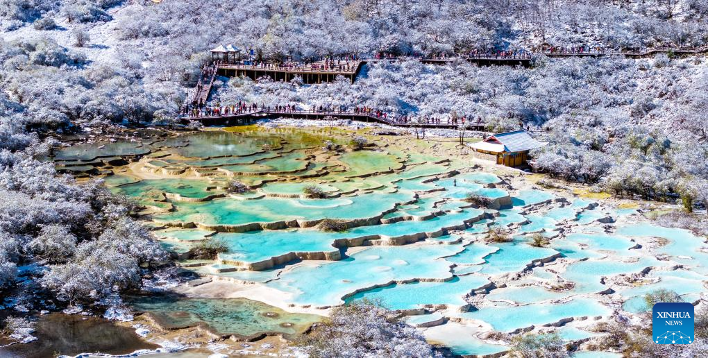 A drone photo taken on Oct. 21, 2025 shows a view of a colorful pond cluster after snow at the Huanglong scenic area in Aba Tibetan and Qiang Autonomous Prefecture, southwest China's Sichuan Province.