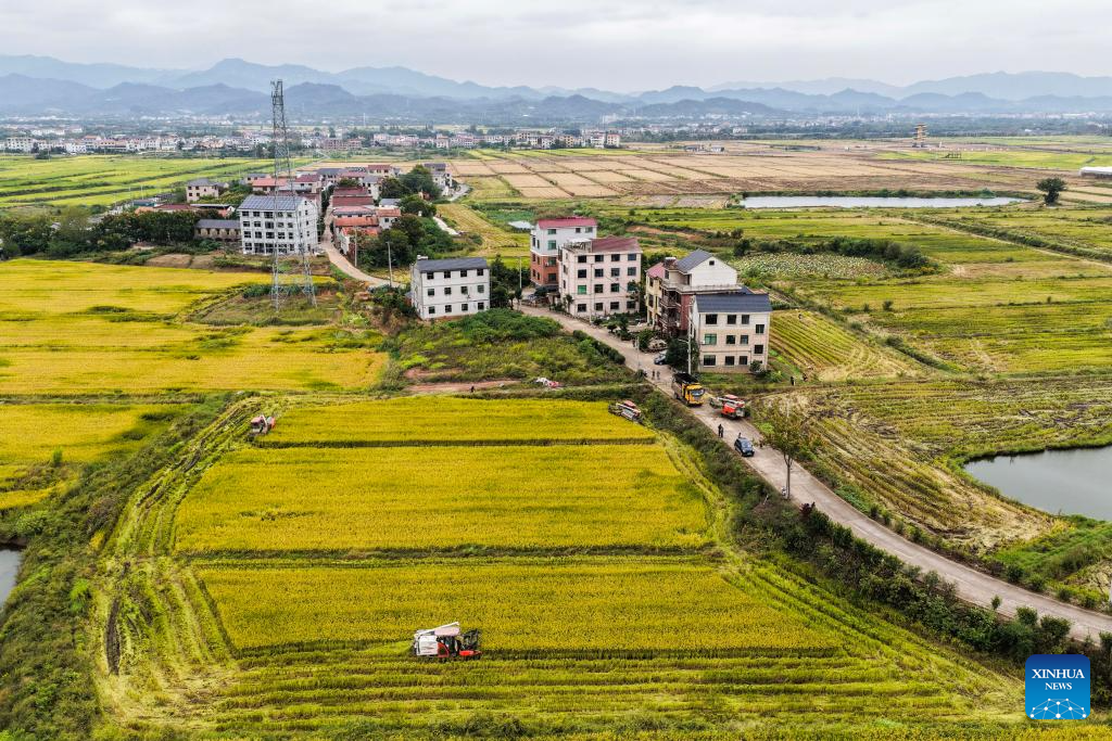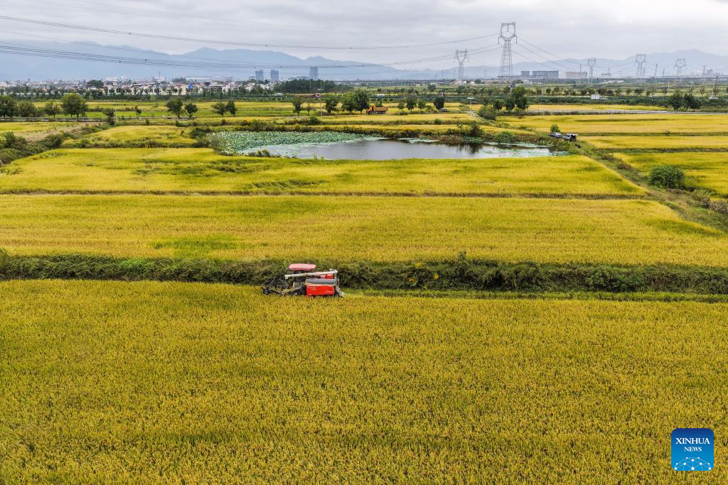 A reaper harvests paddy rice at a high-quality farmland demonstration area in Tangya Town of Jindong District, Jinhua City in east China's Zhejiang Province, on Oct. 22, 2025. (Xinhua/Xu Yu)