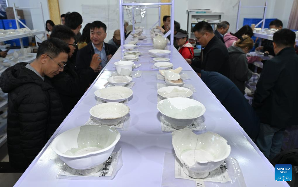 Archaeologists view samples of excavated porcelain at the cultural relics storage room of the archaeologist team working on the remnants of the Suyukou kiln, in Yinchuan, capital of northwest China's Ningxia Hui Autonomous Region, Oct. 13, 2025. Remnants of the Suyukou kiln were discovered in 2017 in Yinchuan, capital of Ningxia, and cover an area of roughly 40,000 square meters. (Xinhua/Wang Peng)