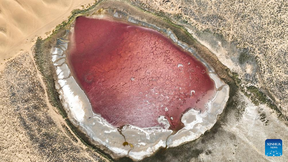 A drone photo taken on Oct. 22, 2025 shows a lake in the Badain Jaran Desert in Alxa Right Banner, the Alxa League of north China's Inner Mongolia Autonomous Region. The Badain Jaran Desert was included on the World Heritage List in July 2024. (Xinhua/Bei He)