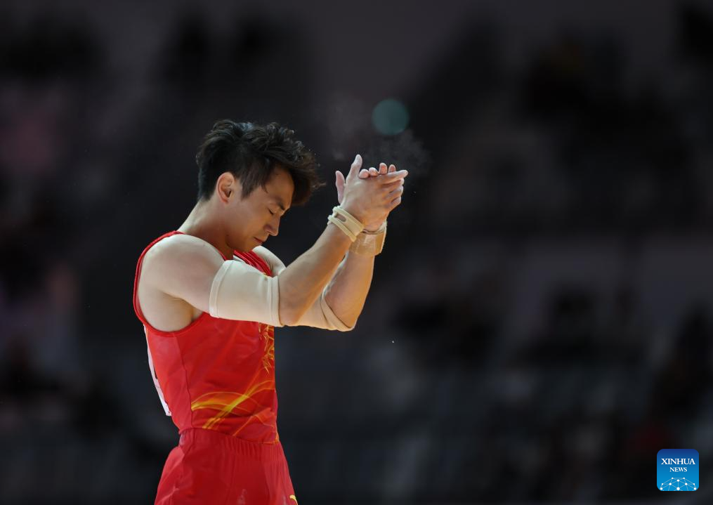 Zou Jingyuan of China prepares during the the Men's Parallel Bars Final at 53rd FIG Artistic Gymnastics World Championships in Jakarta, Indonesia, on Oct. 25, 2025. (Xinhua/Bai Xuefei)