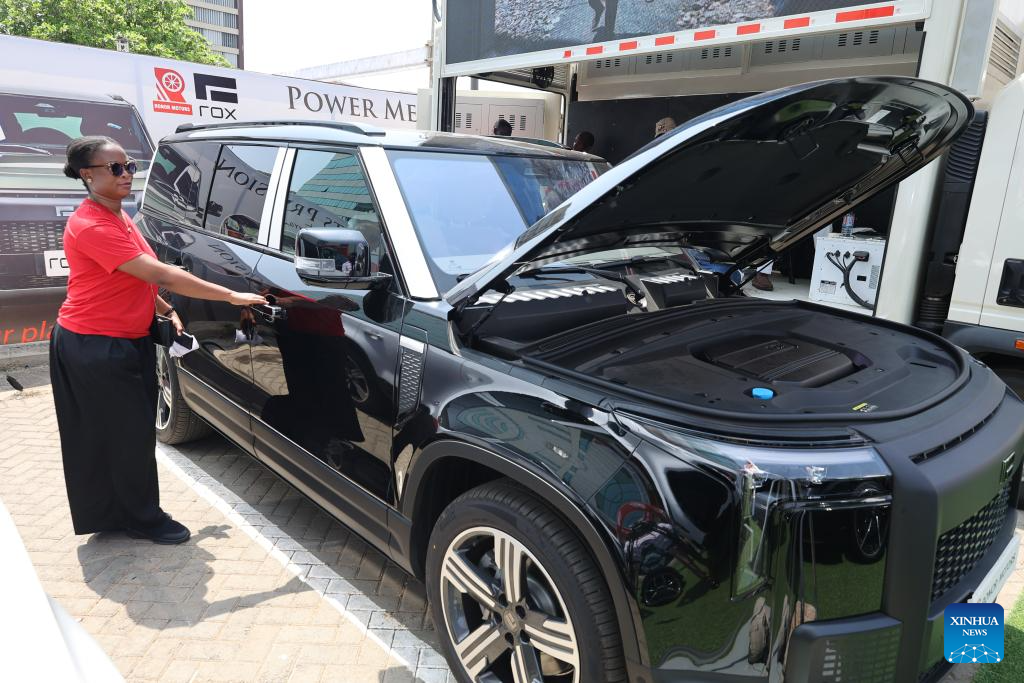 A visitor views an electric vehicle during the Ghana Transport and Logistics Fair in Accra, Ghana, on Oct. 23, 2025. The maiden Ghana Transport and Logistics Fair concluded in Accra on Friday, with Chinese technology taking center stage. (Photo by Seth/Xinhua)