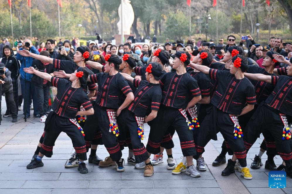 Performers from a Yunnan dance and opera troupe perform during a flash mob event at Renmin park in Urumqi, northwest China's Xinjiang Uygur Autonomous Region, Oct. 27, 2025. A flash mob event featuring ethnic dances was held here on Monday. (Xinhua/Ding Lei)
