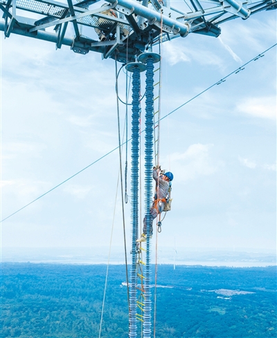 Photo shows a worker replacing composite insulators for a 1,000 kV transmission line in Huaian, east China's Jiangsu Province. (Photo/Shi Jun)