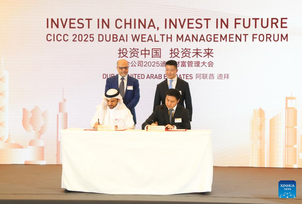 This photo taken on Oct. 31, 2025 shows a scene during a document-signing ceremony at a wealth management forum held by China International Capital Corporation (CICC) in Dubai, the United Arab Emirates (UAE). (Xinhua/Wen Xinnian)