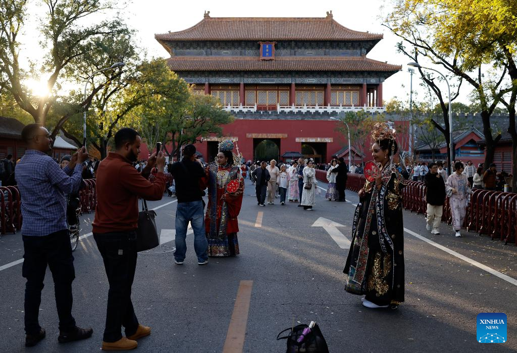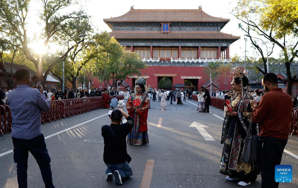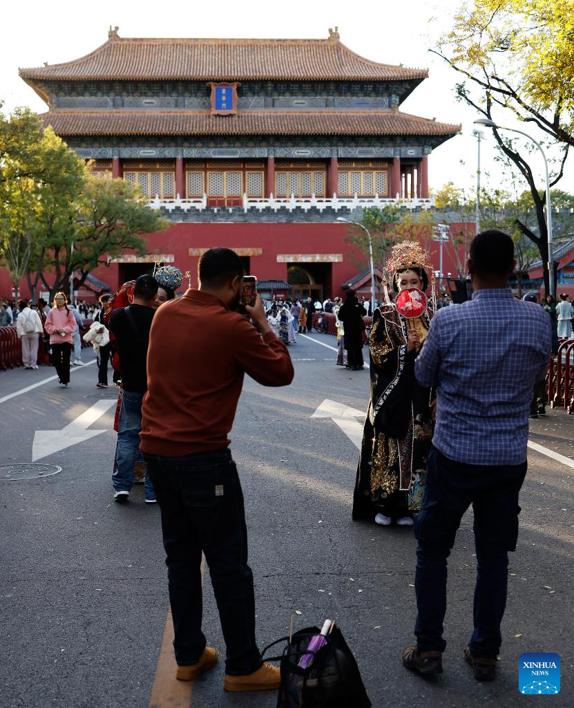 Ethiopian tourist Betty wearing traditional Chinese costumes enjoys her photoshoot experience outside Donghua Gate, as known as East Prosperity Gate of the Palace Museum in Beijing, capital of China, Nov. 1, 2025. From January to September 2025, Beijing has received approximately 3.88 million inbound tourists, a year-on-year increase of 42.9 percent, according to Beijing Municipal Bureau of Culture and Tourism. (Xinhua/Wang Lili)