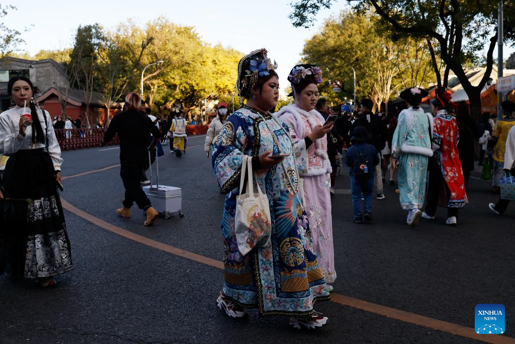 Tourists wearing traditional Chinese costumes walk by Donghua Gate, as known as East Prosperity Gate of the Palace Museum in Beijing, capital of China, Nov. 1, 2025. (Xinhua/Wang Lili)