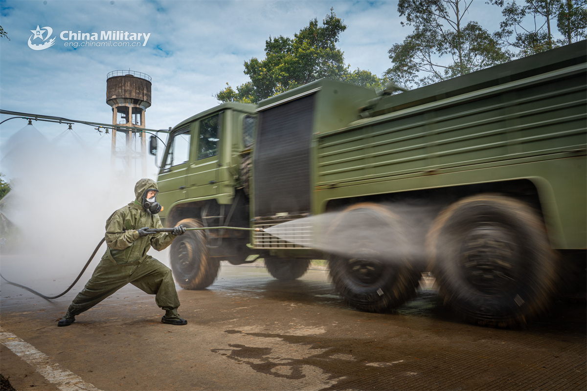 A soldier assigned to a mobile detachment of the Chinese People's Armed Police (PAP) Force Guangxi Corps decontaminates the simulated chemical-contaminated military vehicle during a training exercise on such subjects as live-fire drills with anti-riot armored vehicles, flamethrower firing operation, vehicle decontamination operation and others. (eng.chinamil.com.cn/Photo by Zhang Xinhua)