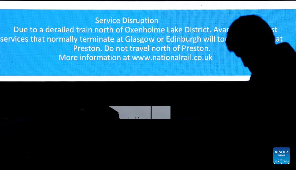A man stands next to a screen showing information on changes to rail services at Euston Station in London, Britain, Nov. 3, 2025. A train carrying 87 people derailed in northwestern England on Monday, disrupting rail services, local media reported. (Xinhua/Li Ying)
