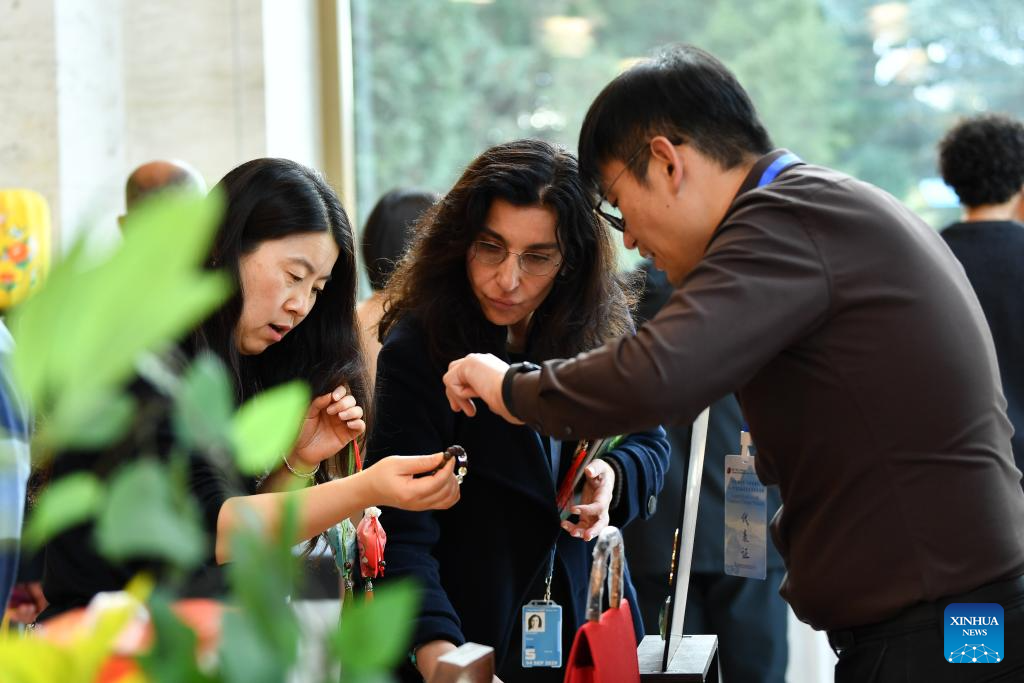 Participants view a bracelet infused with the fragrance of ginseng during the cultural event "TCM Connects the World, Ginseng Perfumes Chongyang -- Art and Tradition of Chinese Medicine" at the Palais des Nations in Geneva, Switzerland, Oct. 29, 2025. The event featured demonstrations of Traditional Chinese Medicine (TCM) exercises, ginseng tasting, herbal sachet making, and wellness activities, offering participants an opportunity to learn about the health philosophy behind TCM. (Xinhua/Lian Yi)