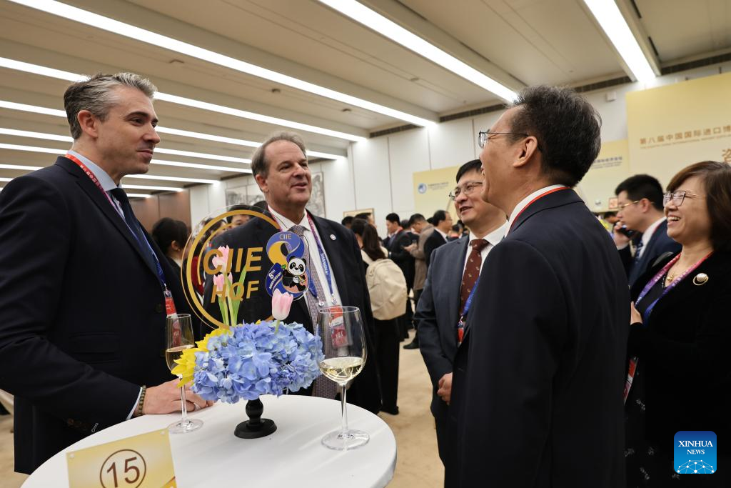 Guests talk at the venue of the opening ceremony of the eighth China International Import Expo (CIIE) and the Hongqiao International Economic Forum in Shanghai, east China, Nov. 5, 2025. The eighth CIIE and Hongqiao International Economic Forum opened here on Wednesday. (Xinhua/Fang Zhe)