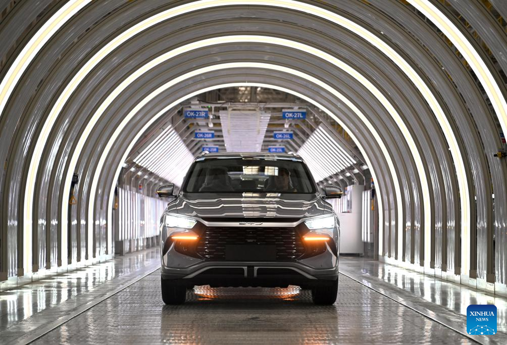 This photo taken on Nov. 3, 2025 shows a new energy vehicle (NEV) assembly line of BYD, China's leading NEV manufacturer, at the plant of BYD in Zhengzhou, central China's Henan Province. As an important industrial base in central China, Henan Province has actively promoted the high-quality development of its manufacturing sector through scientific and technological innovation and industrial upgrading. (Xinhua/Li Jianan)