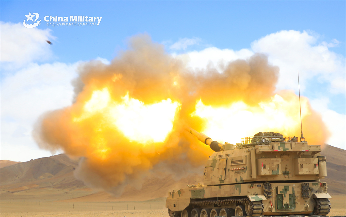 A PLZ-05 155mm self-propelled howitzer attached to a brigade under the Chinese PLA 76th Group Army fires at the mock target in a live-fire shooting training exercise. (eng.chinamil.com.cn/Photo by He Dan)
